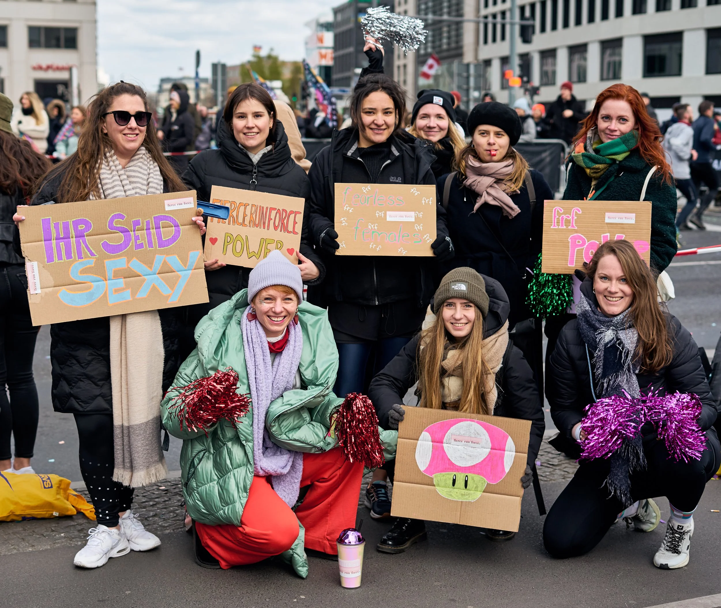 Auch die, die nicht mitgelaufen sind, haben sich morgens an der Strecke eingefunden, um unsere Läuferinnen anzufeuern. Die Stimmung am Cheering Point war trotz der Kälte ausgelassen. Super viele Menschen, mit Schildern, Pfeifen und Konfettikanonen ausgerüstet, gaben ihr Bestes um den Läufer*innen zu zeigen: Ihr macht das großartig!