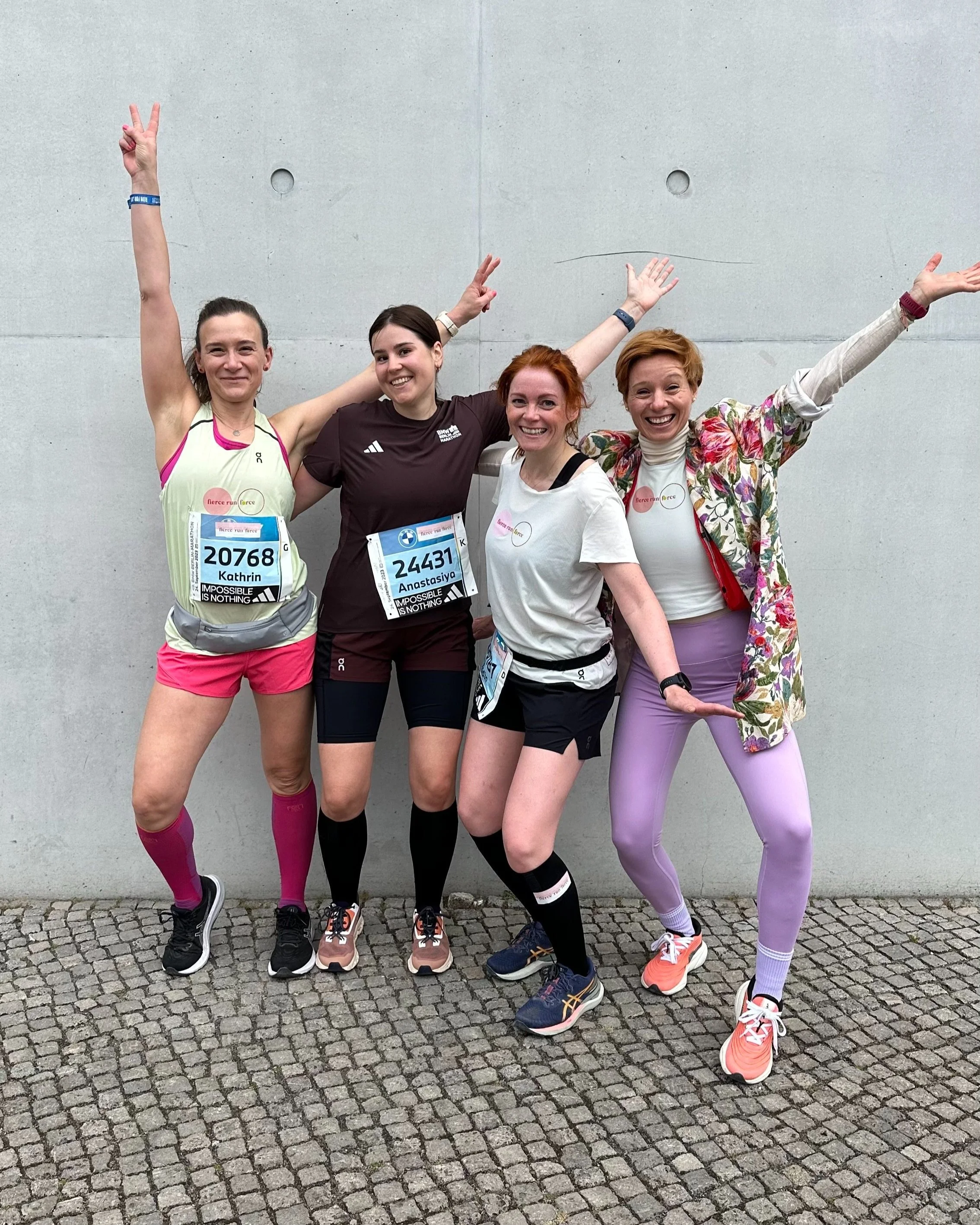 „Die Aufregung kam erst am Tag vor dem Marathon, als wir gemeinsam mit unserer Lauftrainerin Steffi und tausenden anderen Läufer*innen die Starterunterlagen abholten. Der Race Day startete entspannt und nach einem gemeinsamen Aufwärmen gingen wir drei Marathon-Newbies ganz euphorisch Richtung Startblock. Zu der Zeit hätte ich nicht gedacht, dass mein Kopf schneller mein Endgegner sein wird als meine Beine. Im Training lief ich gefühlt hunderte Male die Halbmarathon-Distanz ohne Probleme.