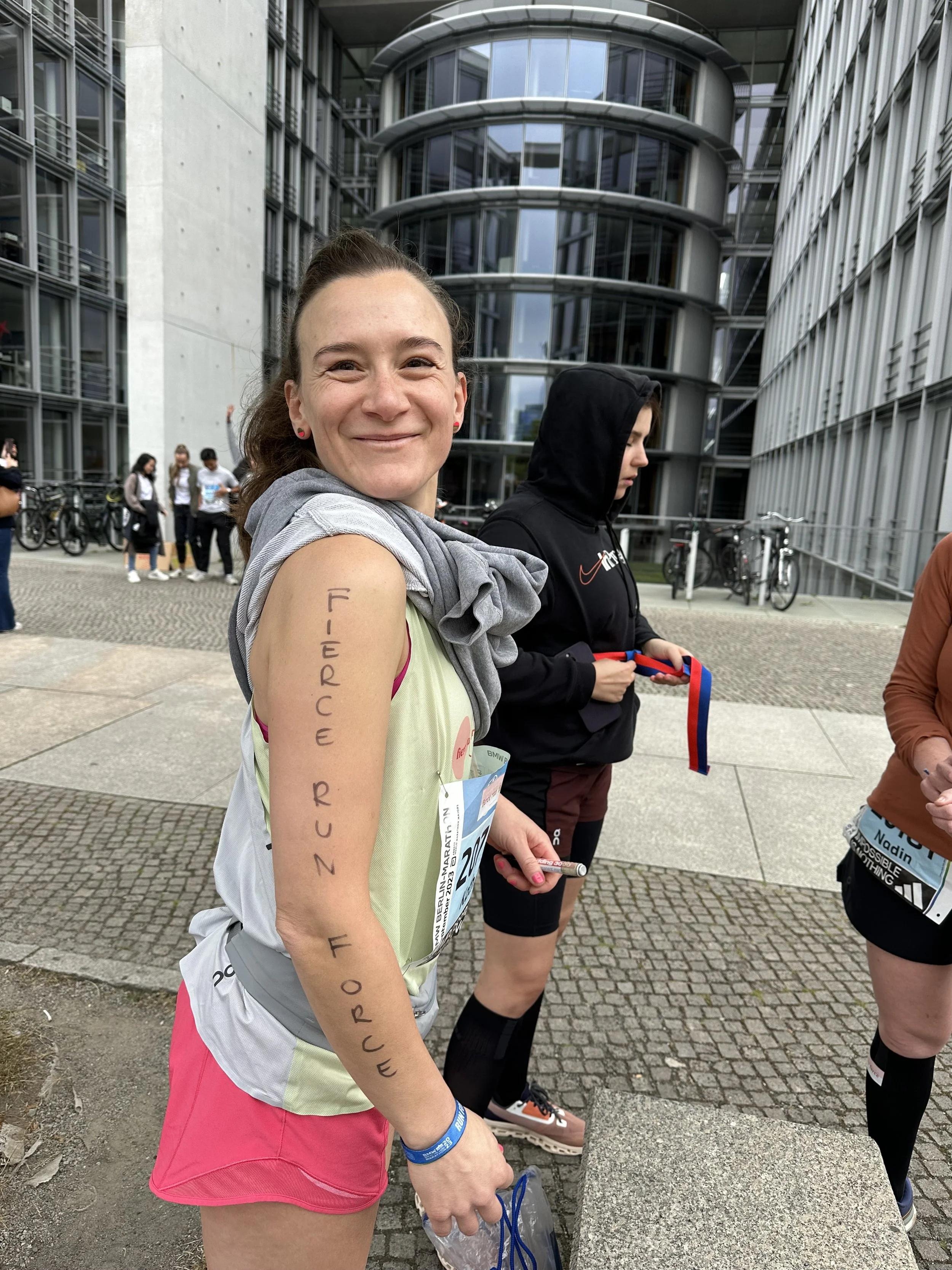 Meine Reise zu diesem 42,2 km Lauf war lang, ähnlich lang wie es doch am Ende auch ein solches Marathonrennen ist, in dem du verschiedene Phasen durchläufst. Der Trainingsbeginn Anfang 2023 war zu Beginn meines Trainingshalbjahres ein stetiges Auf und Ab: beim Halbmarathon quäle ich mich noch sehr durch die Straßen Berlins, zu diesem Zeitpunkt fühlte sich die volle Distanz noch sehr weit weg an. Dann war auch noch das restliche Frühjahr von Infekten gespickt. Bis endlich ab Juni ein Wendepunkt kam. Endlich geht es trainingsmäßig super voran! Inzwischen bin ich auch bei FIERCE RUN FORCE e.V. Mitglied geworden und habe seit Mai ein Team samt Trainerin an meiner Seite, die ich zweimal die Woche zum gemeinsamen Training sehe. Außerdem habe ich mit Nadin und Anastasyia zwei Mitstreiterinnen im Team, die auch danach streben, den Marathon zu laufen.Mir ist wichtig nach meiner Trainingsjourney, anderen mitzugeben, was mir geholfen hat: mindestens einmal pro Woche Gewichte stemmen – gerade wir Frauen –, Beine nicht nur Kilometer laufen lassen, sondern auch gezielt kräftigen und Stabis sowieso ins Training einbauen. Zum Glück sind Stabis und Kräftigung mit eigenem Körpergewicht auch Teil des MOVEMENT MONDAYs. Denn im Team absolviert, ist das leichter getan. Außerdem hat das richtige Mindset einen unheimlich großen Wert. Ich habe für mich Folgendes etabliert: Das ist mein erster Marathon, deshalb heißt es für mich Hauptsache gesund anzukommen. Natürlich sind das keine Zaubermittelchen und zu sagen, dass die 42 km im Flug vergangen wären, wäre nicht ehrlich, was ich aber sagen kann, dass ich mich fast bis ins Ziel locker gefühlt habe, fast schon entspannt, denn es hat einfach großen Spaß gemacht und ich habe es regelrecht genossen. Auch die Angst vor dem Mann mit dem Hammer war für mich kein Thema. Denn er kam auch nicht – zu meinem Glück.