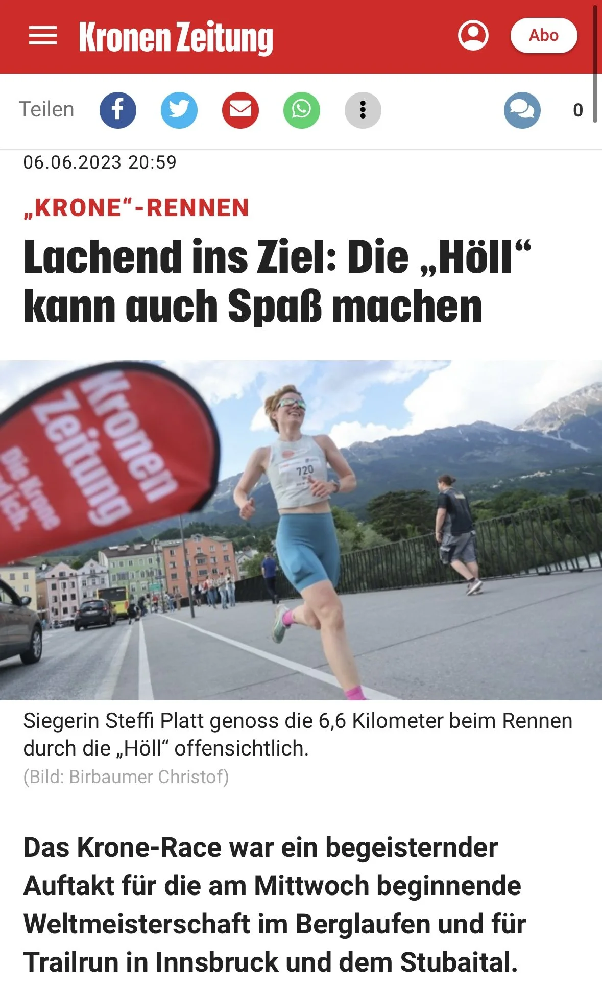 Kurz und knackig oder 69 km lang - wir haben in diesem Jahr das Trail Running für uns entdeckt und uns bereits mehrfach durchgekämpft, gestaunt, abgeräumt und die Berge genossen. Die Saison hat Lauftrainerin Steffi eröffnet und gleichzeitig auch damit die WM. Das Public Race von 6 km und ein paar Zerquetschten war die Einleitung in ein aufregendes Großereignis. Gebührend wurde nicht nur die Eröffnungsfeier im Anschluss gefeiert, sondern auch Steffi auf dem Weg zum Sieg. Ganz mutig und voller Vorfreude auf die Berge und das Rennen, lief sie vorne mit. Schnell übernahm sie – ganz verwundert – die Spitze und ließ die jüngeren Läuferinnen hinter sich.