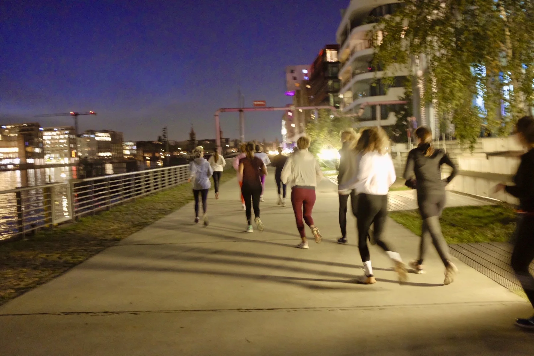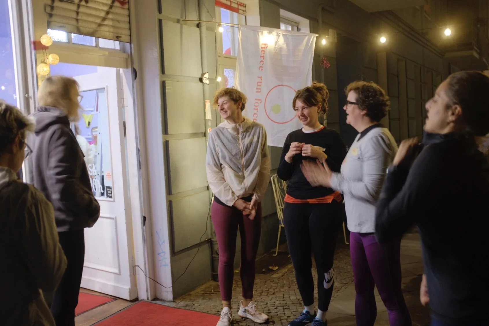 Nach der Vorstellungsrunde und einem ersten Austausch starten die Teilnehmerinnen einen 30-minütigen Lauf durch Friedrichshain. Schon nach wenigen Metern feuert ein Mann die Gruppe an: „schneller, Ladys“. Unangenehme Sprüche und Kommentare kennen viele Läuferinnen. FRF e.V. macht sich auch dafür stark, dass Frauen sicher laufen können, gerade wenn es dunkel ist. Nach dem Lauf schaltet Steffi die Sportlerin und Physiotherapeutin Judith Joosten dazu. Sie führt die Gruppe wie jeden Montagabend durch Beinachsentraining, Krafttraining für einen stabilen Rumpf oder klassisches Dehnen und hilft damit, Verletzungen vorzubeugen.